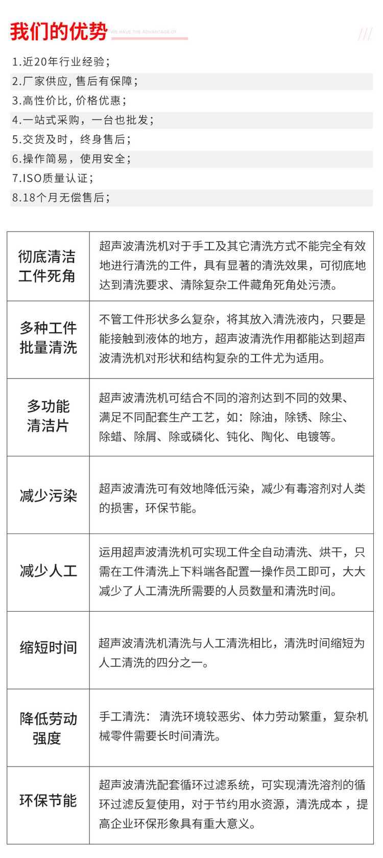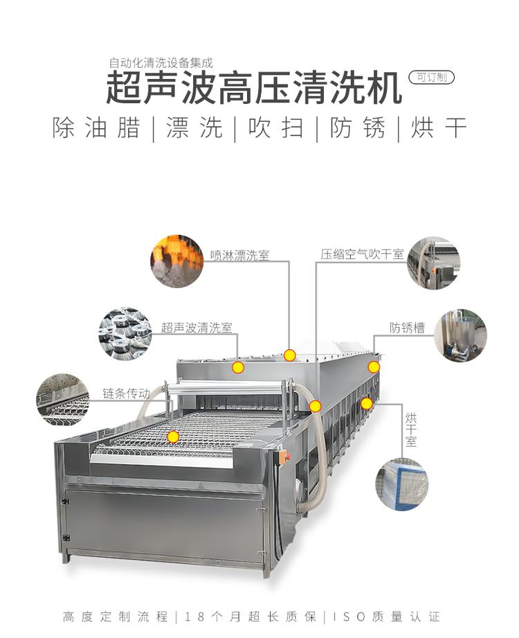鋁合金壓鑄件噴淋清洗機(jī)是一臺(tái)履帶式超聲波清洗烘干線,采用特制網(wǎng)鏈傳動(dòng)輸送工件,具有超聲波粗洗、超聲波精洗、鼓泡過水、切水、烘干、等功能的新穎連續(xù)式清洗烘干設(shè)備。由人工將工件放在特制的傳動(dòng)網(wǎng)鏈上,工作時(shí),清洗工件置于輸送帶上,依次通過清洗室、清洗室、漂洗室、切水室、烘干室完成清洗、漂洗、過水、吹水、烘干等流程后出料,超聲波槽回液經(jīng)過濾處理循環(huán)使用,該機(jī)具有工位多,功能全,結(jié)構(gòu)合理,操作方便,清洗效果好的優(yōu)點(diǎn),這對(duì)于流水線零件的清洗,改善勞動(dòng)環(huán)境,節(jié)省勞動(dòng)力,提高清洗和吹干質(zhì)量,具有重要的意義,適用范圍:如LED燈杯、燈座、燈罩、燈殼、鋁殼、沖壓鋁件,電機(jī)外殼、散熱器、五金配件等等。